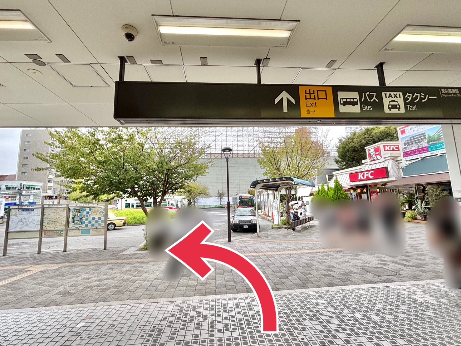 バスロータリーを右目に見ながら、駅前広場をまっすぐお進みください。