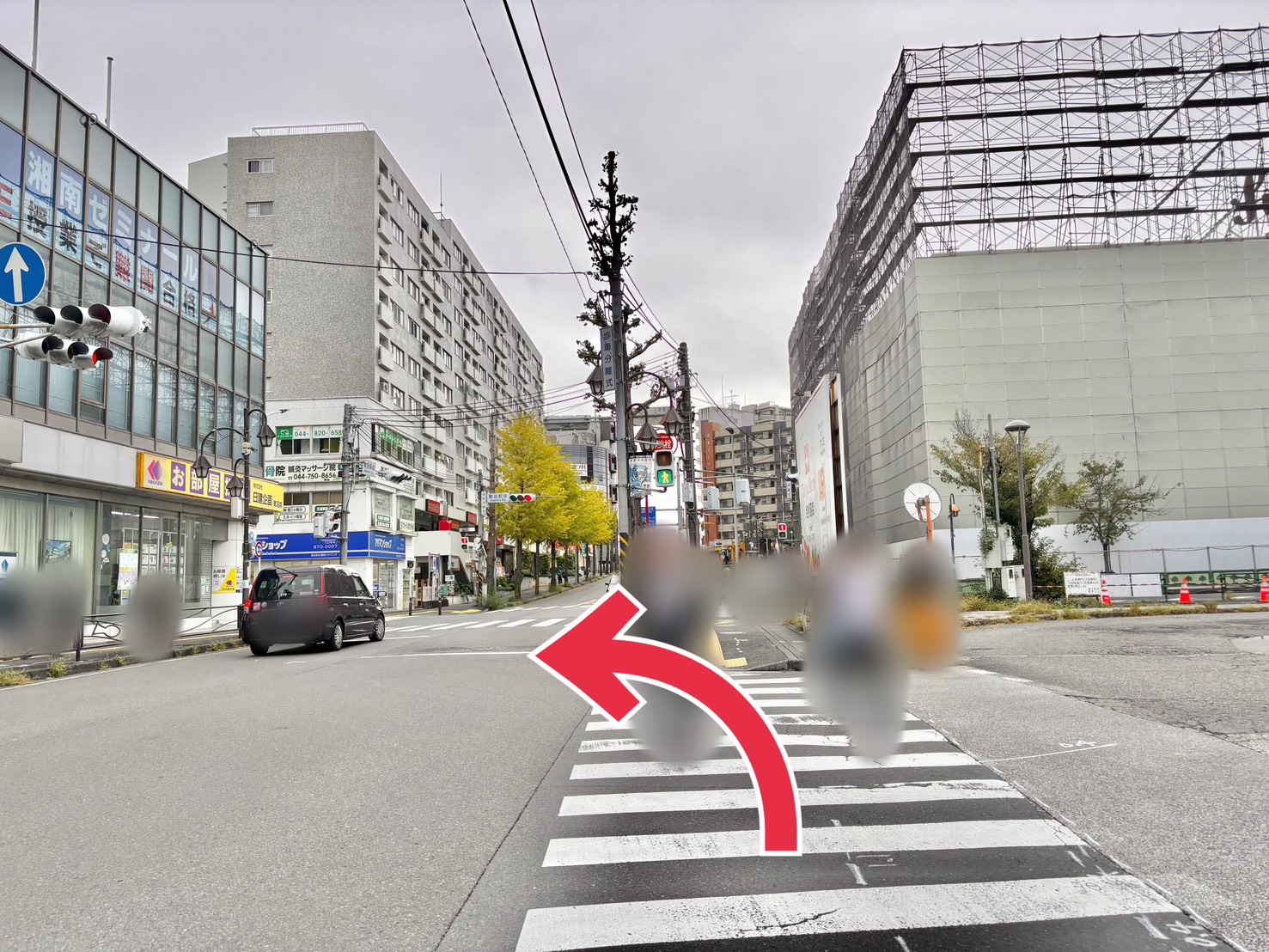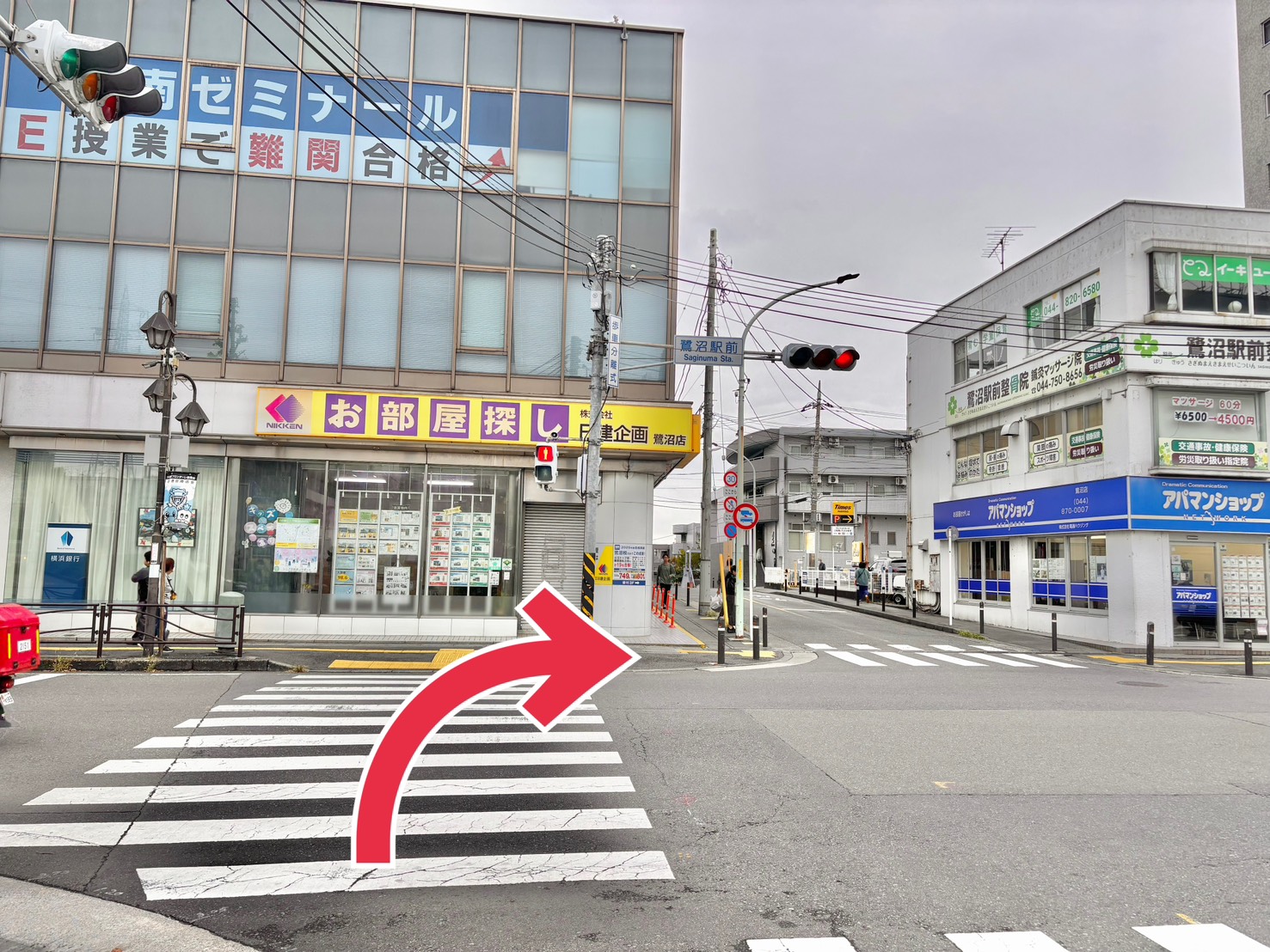 「お部屋探し」の黄色い看板が目印の「鷺沼駅前」交差点に着きましたら、右方向へお進みください。